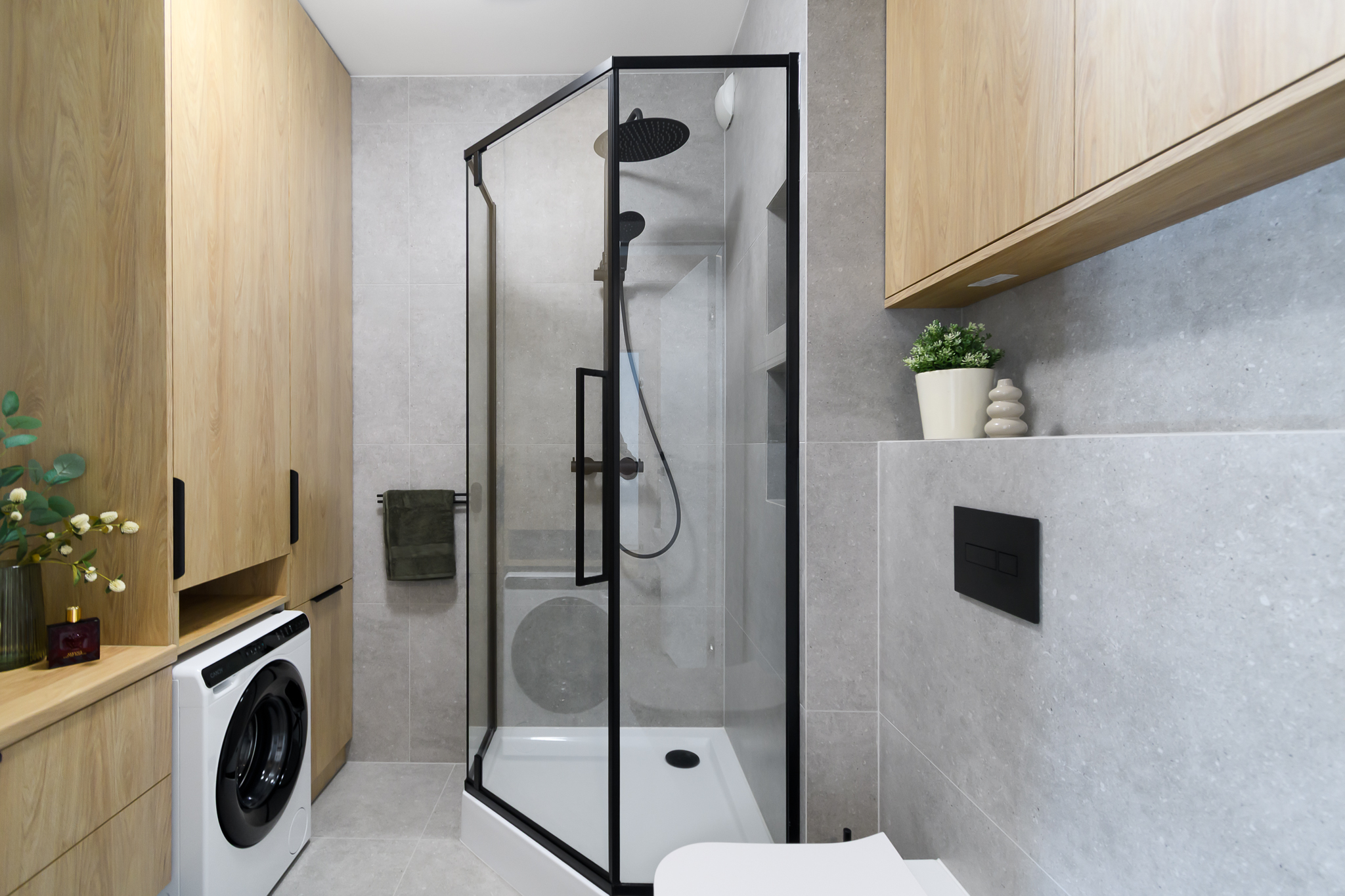 Łazienka: przestronny prysznic, eleganckie wykończenie, funkcjonalne szafki