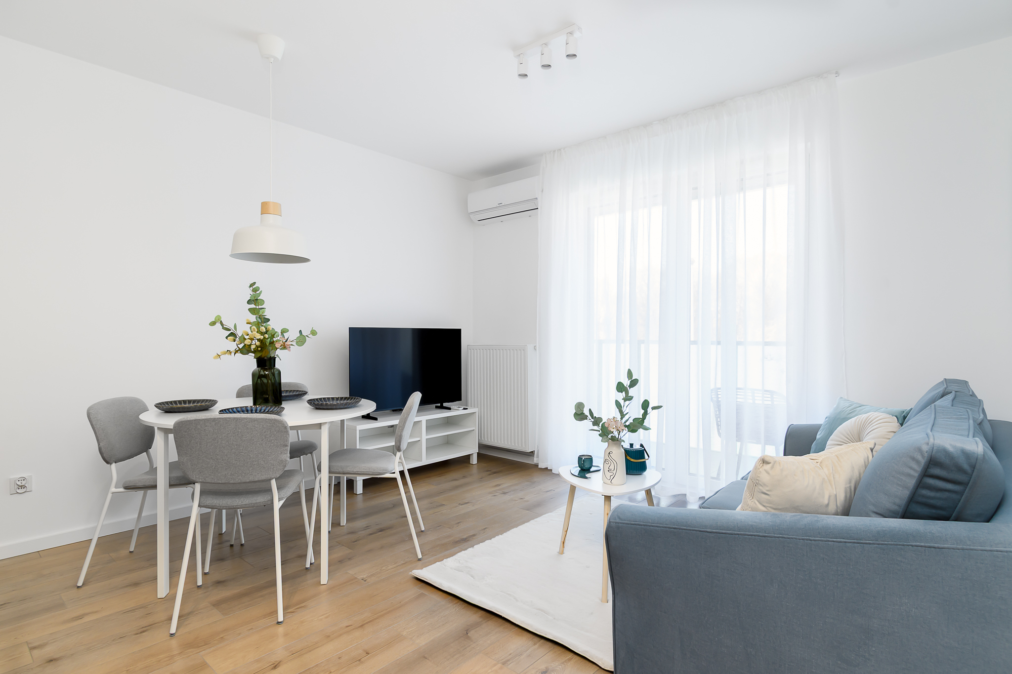 Salon z aneksem kuchennym: rozkładana kanapa, szafka RTV, stolik kawowy, duży stół z krzesłami, wyjście na przestronny balkon