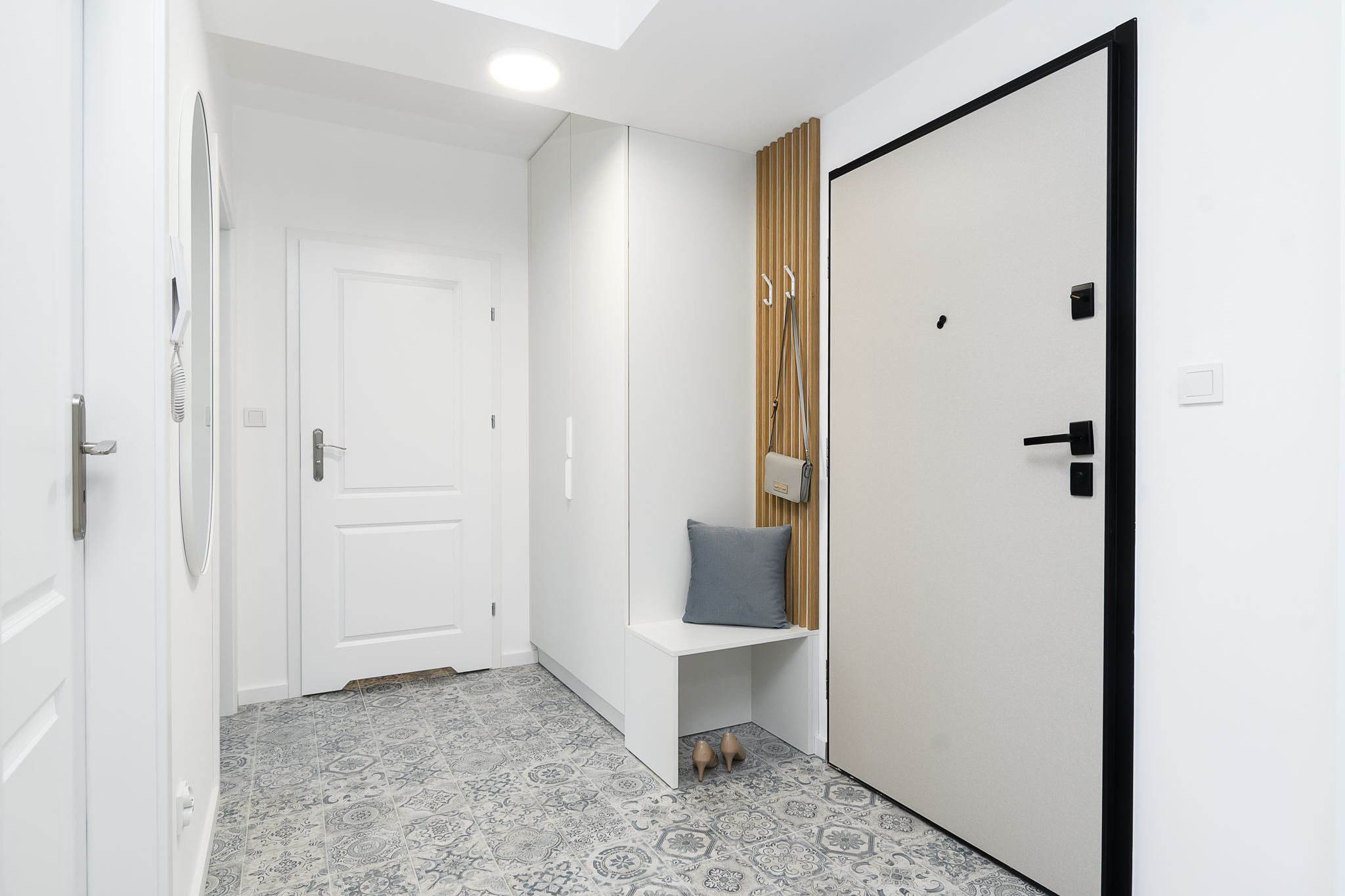 Przedpokój: duża szafa na odzież wierzchnią, szafka na buty
