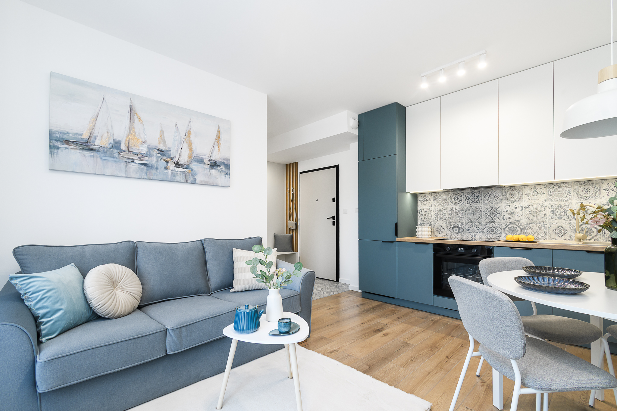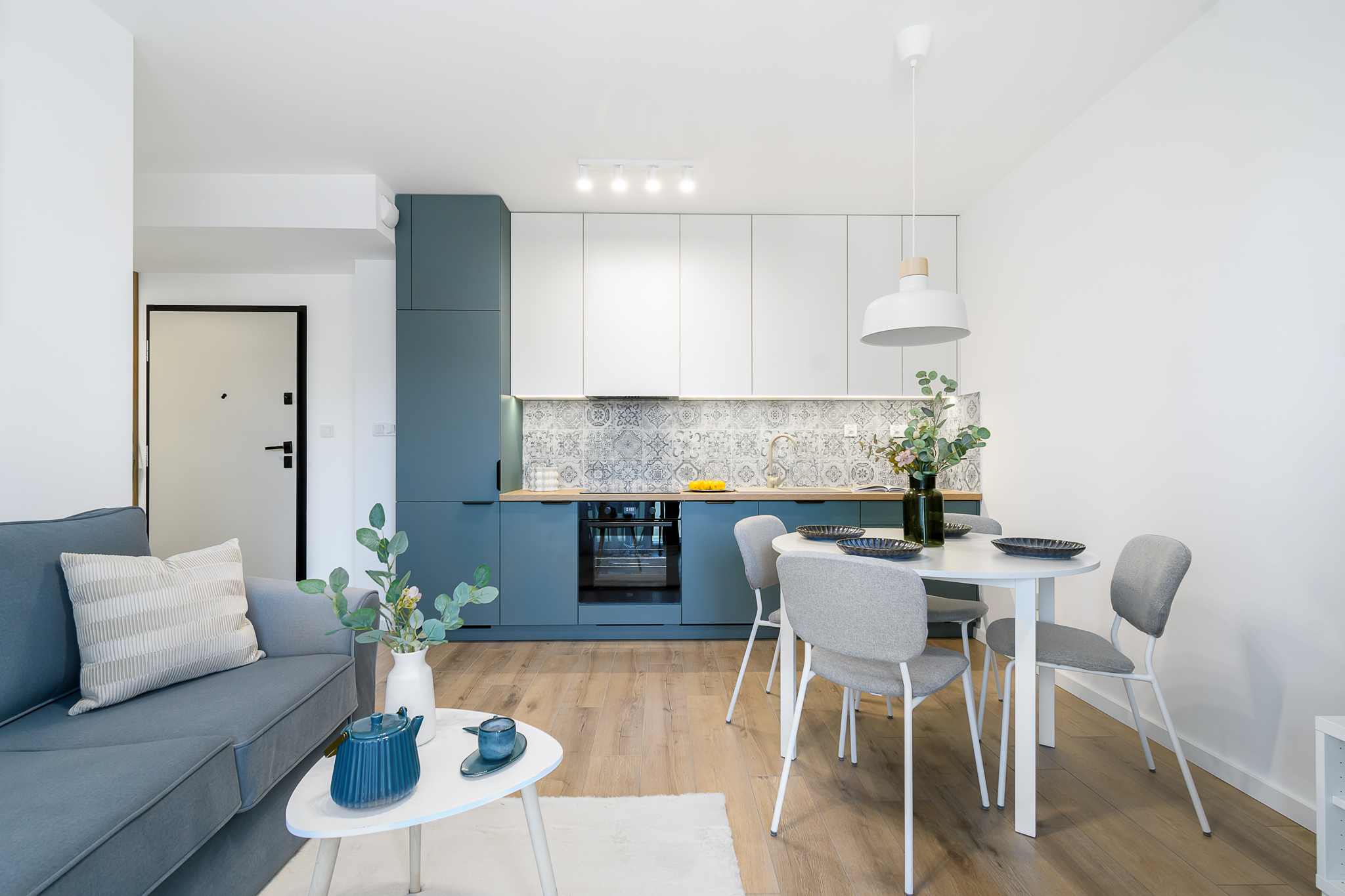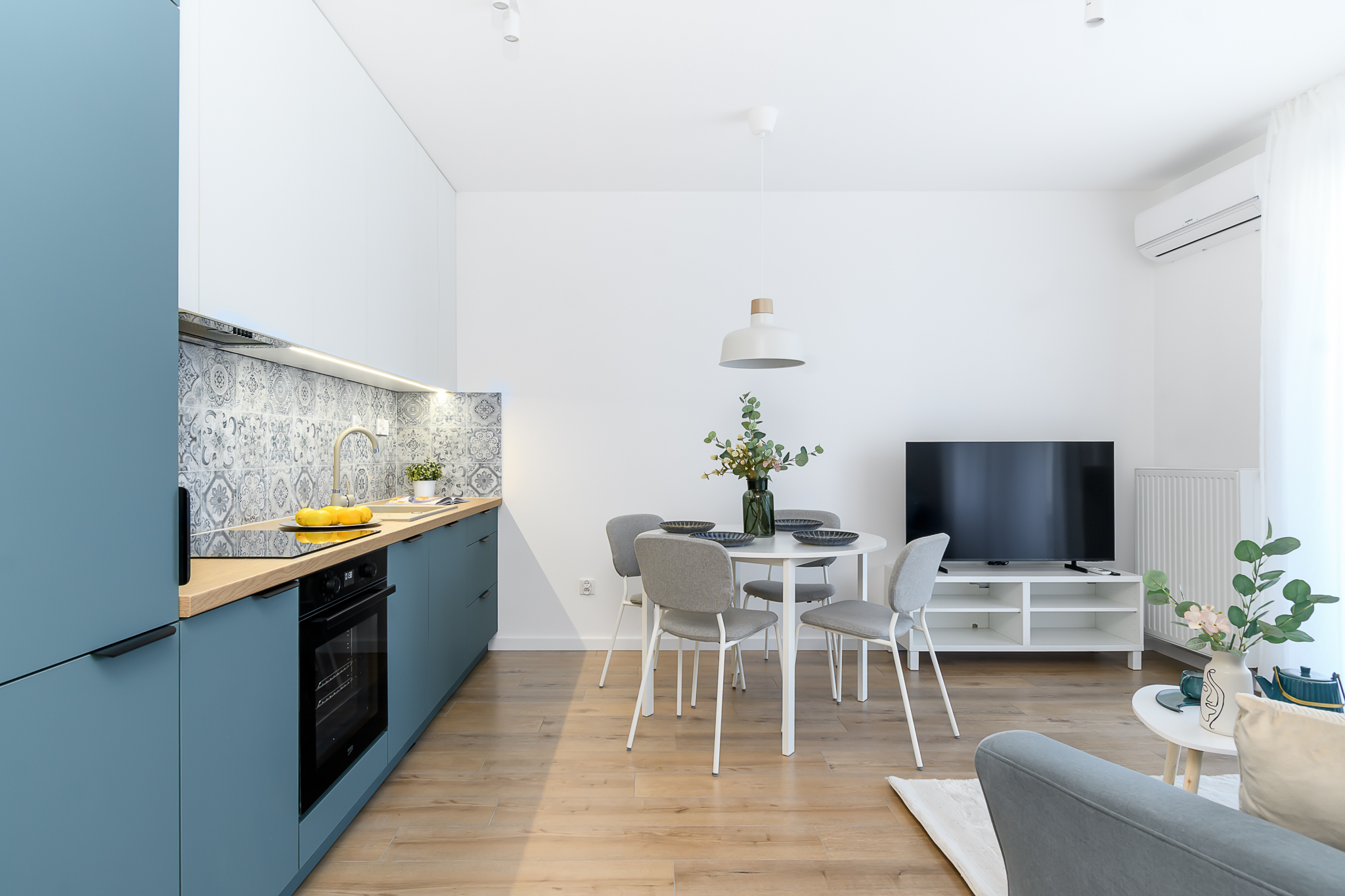 Wnętrze zostało zaprojektowane w sposób funkcjonalny i elegancki, z wykorzystaniem mebli na wymiar oraz wysokiej jakości sprzętu AGD. Całość aranżacji została przygotowana z myślą o komforcie przyszłych mieszkańców.