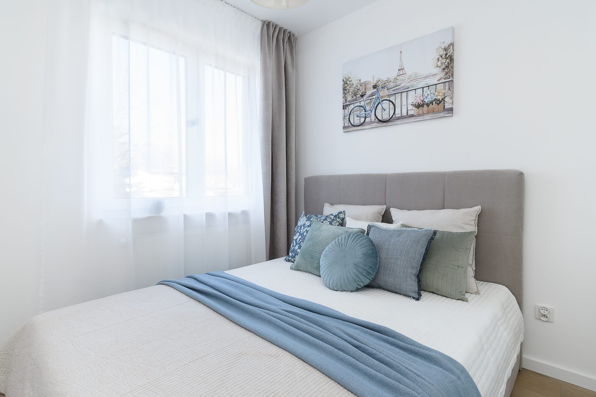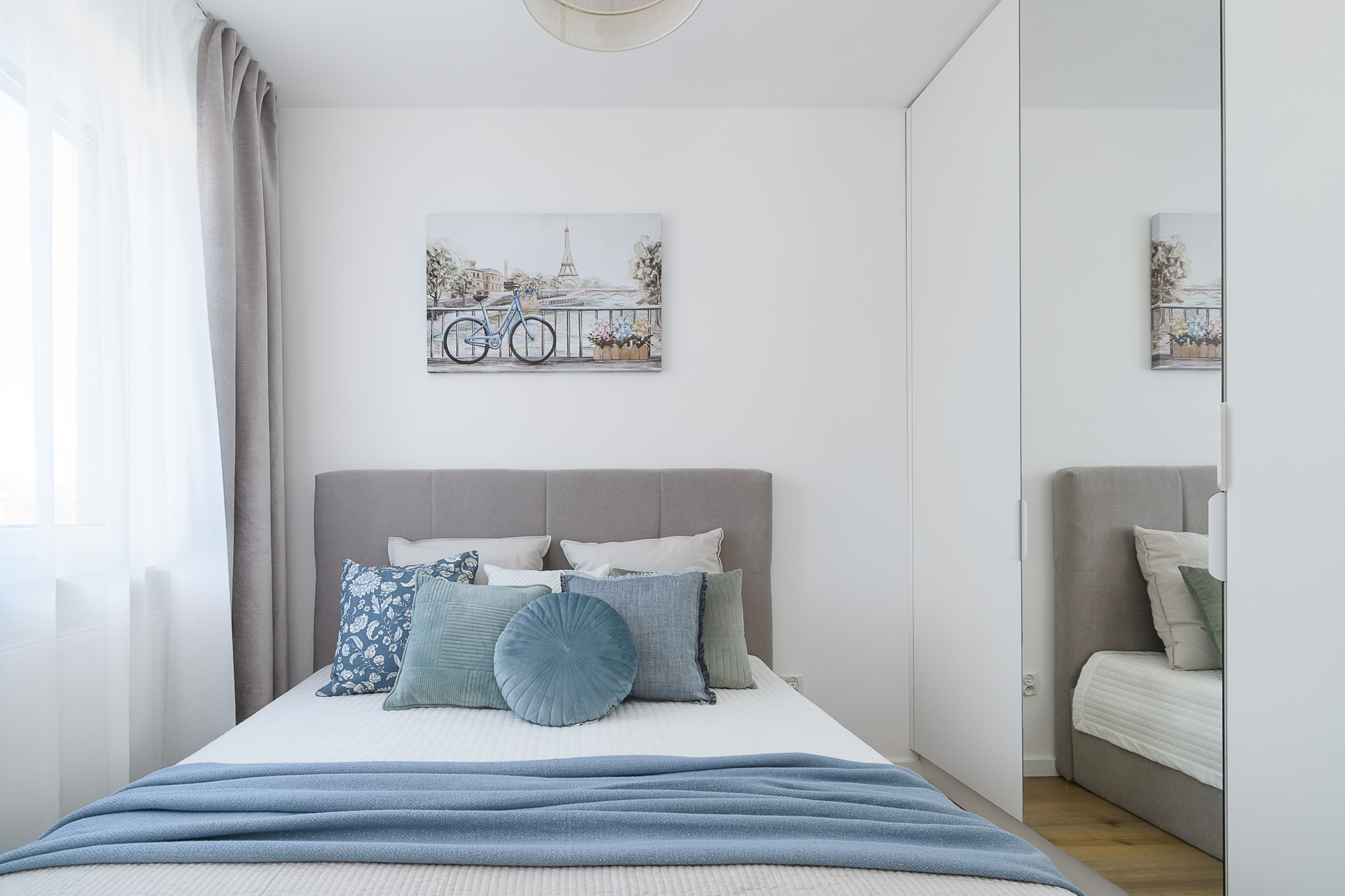 Sypialnia: duże łóżko o szerokości 160 cm, pojemna szafa w zabudowie. Wnętrze zostało zaprojektowane tak, aby sprzyjało odpoczynkowi i relaksowi.