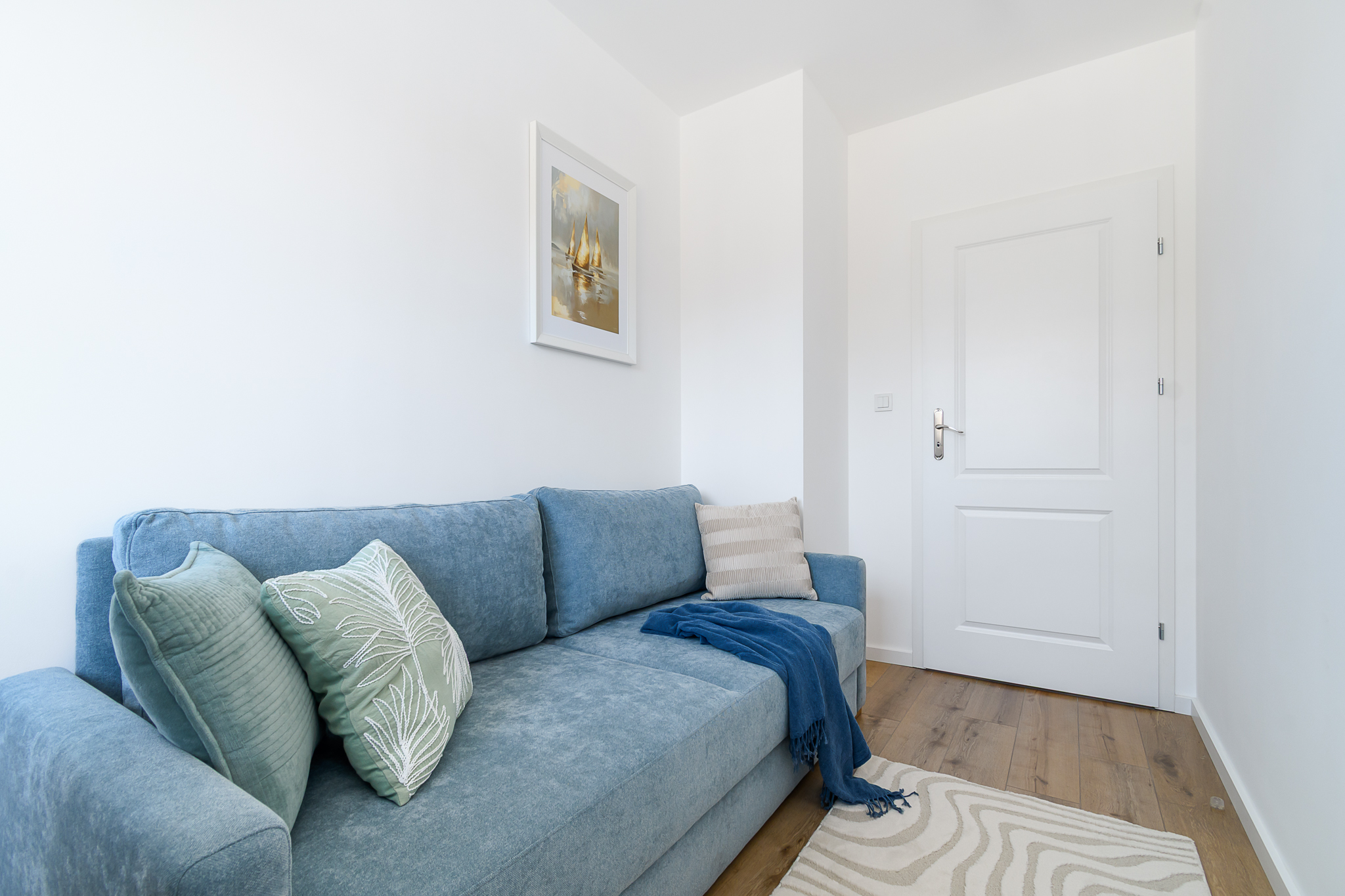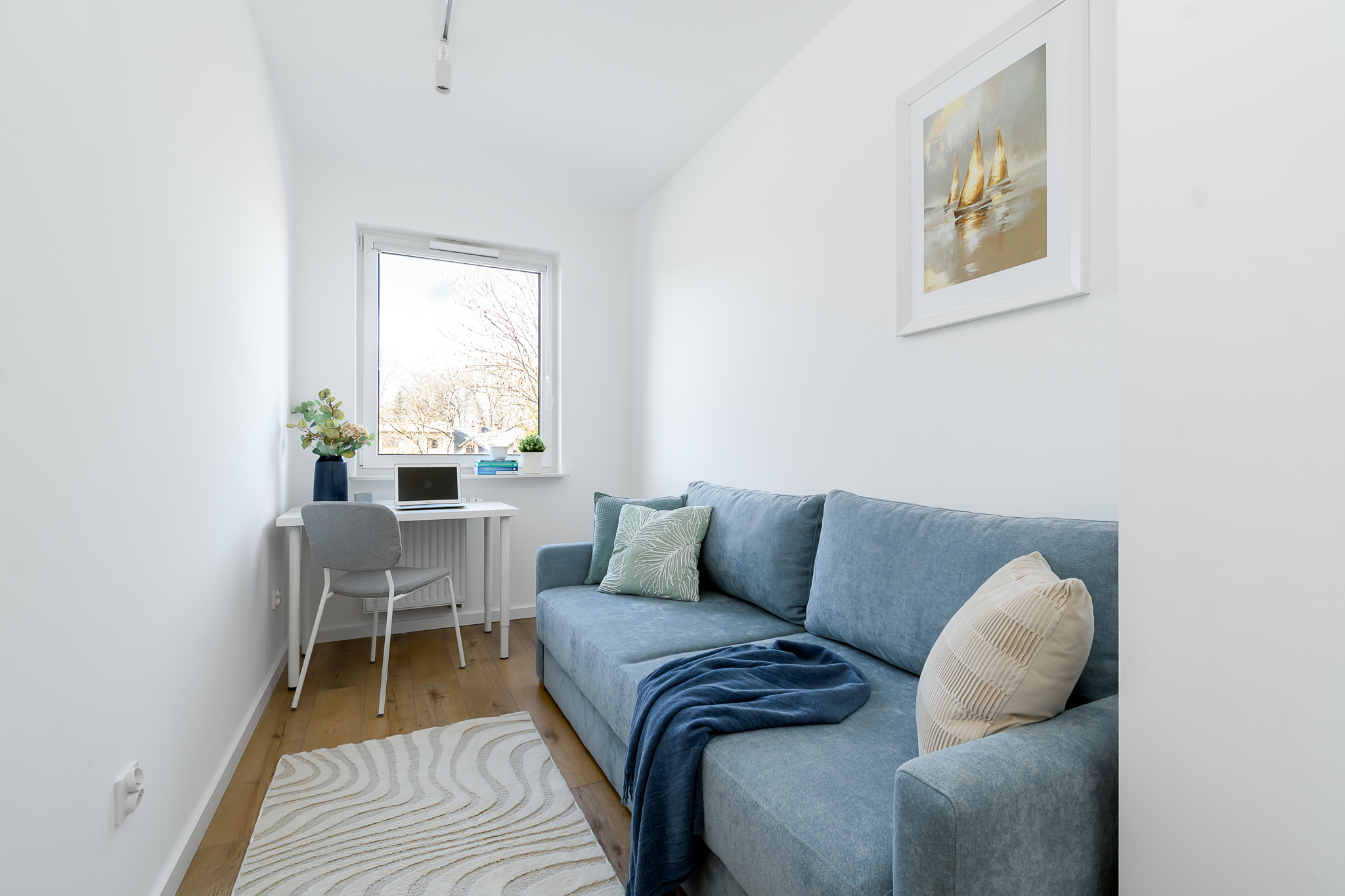 Drugi pokój: rozkładane łóżko, biurko. Pokój może pełnić funkcję pokoju biurowego, gabinetu lub pokoju gościnnego.