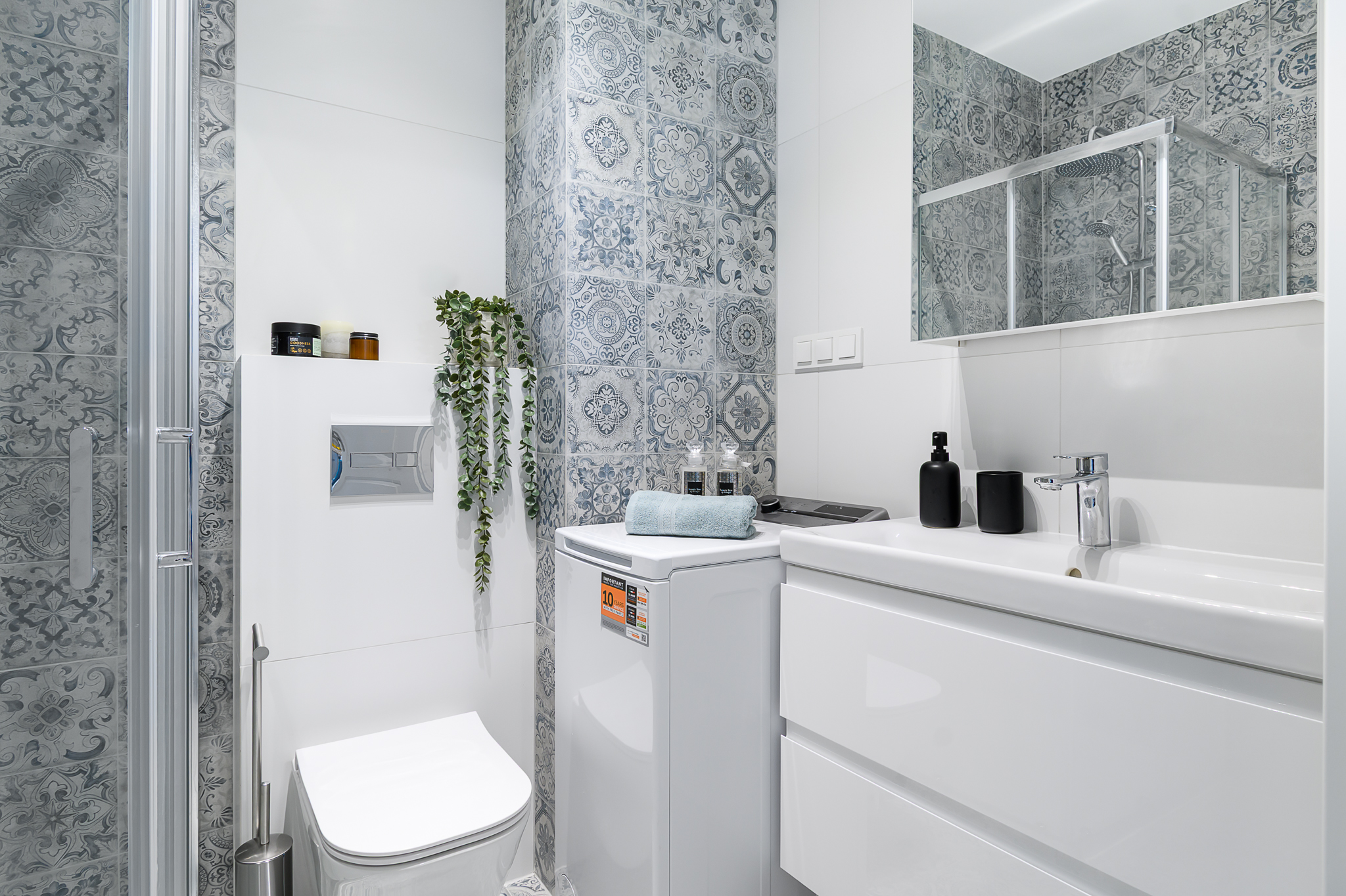 Elegancka i funkcjonalna łazienka z miejscem do przechowywania akcesoriów oraz nowoczesnym wykończeniem.